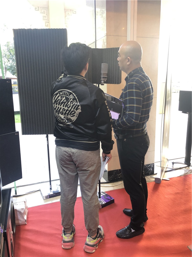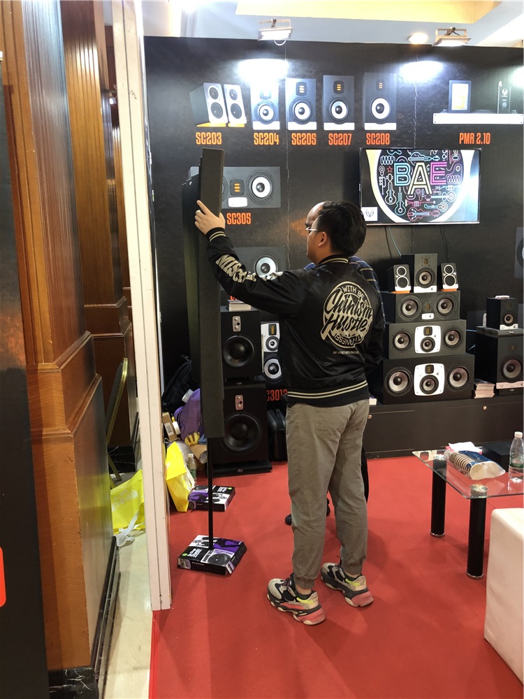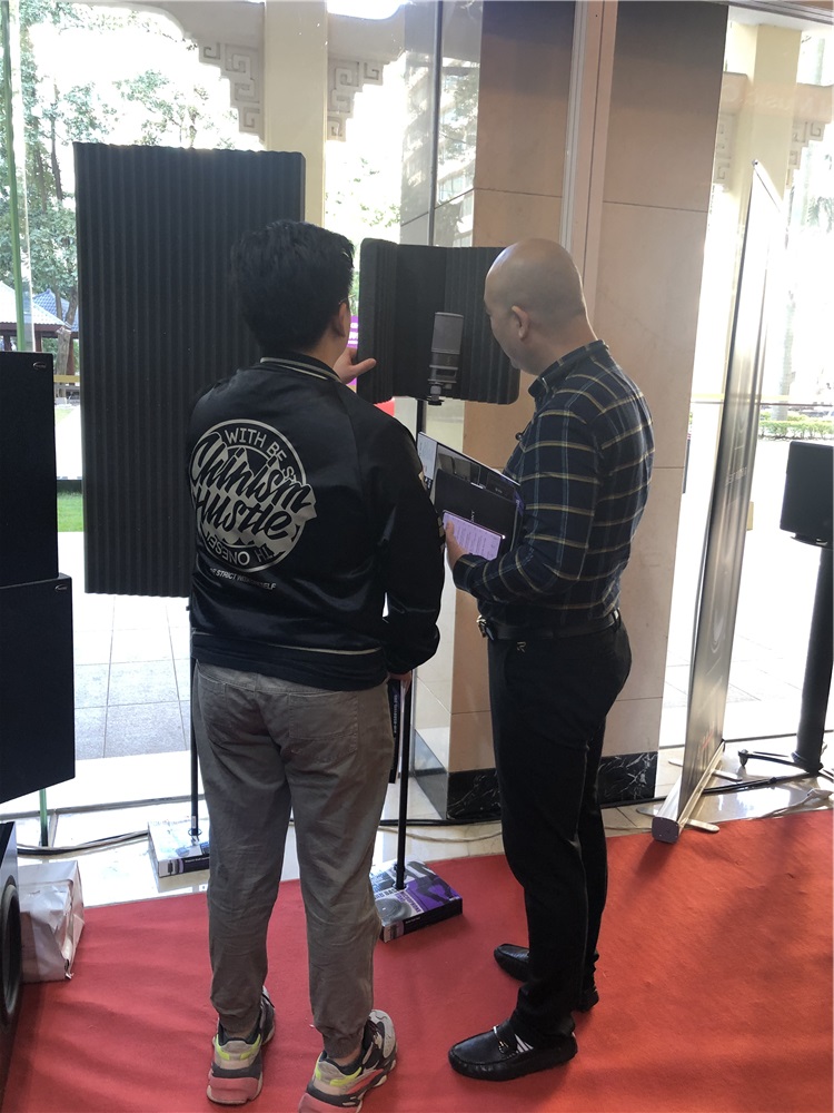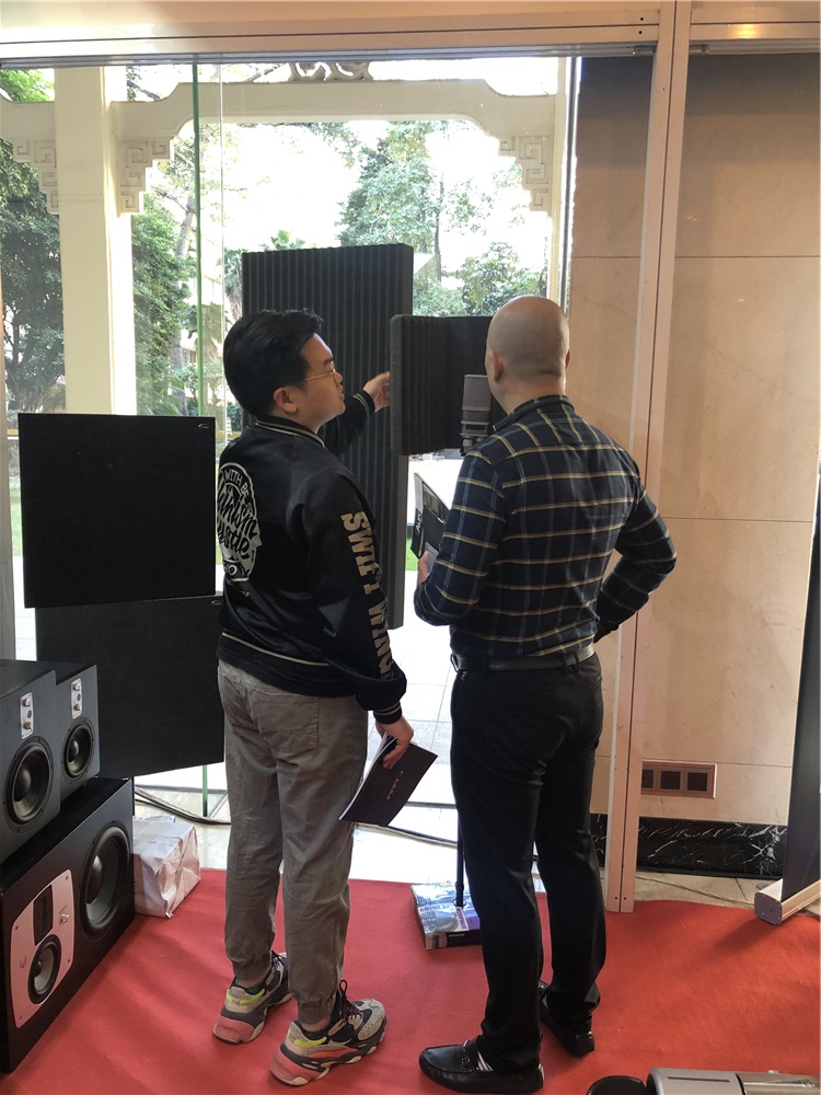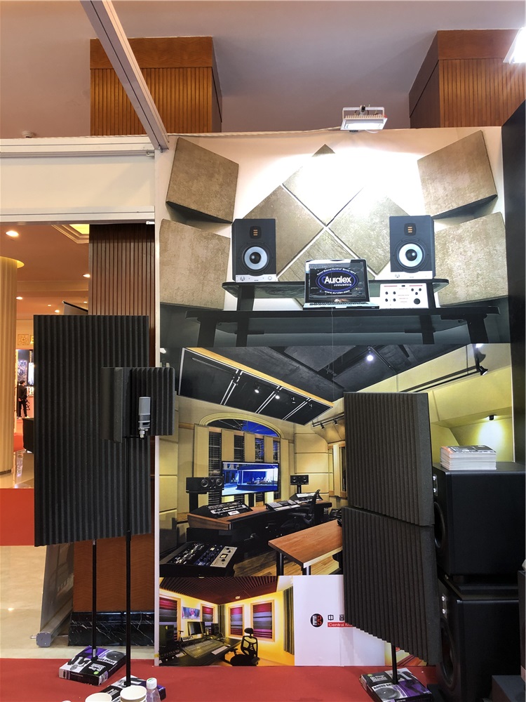 在12月初举办的广州国际音响唱片展上,来自美国的 Auralex 声学材料引起了不少观众的驻足,不少专业人士对产品表现出了浓厚的兴趣。我们这次展出了比较经典的几款产品实物。除此之外,采用了电子展示方式对 Arualex 品牌的免费测算房间 app 和其他产品,进行了轮播展示。