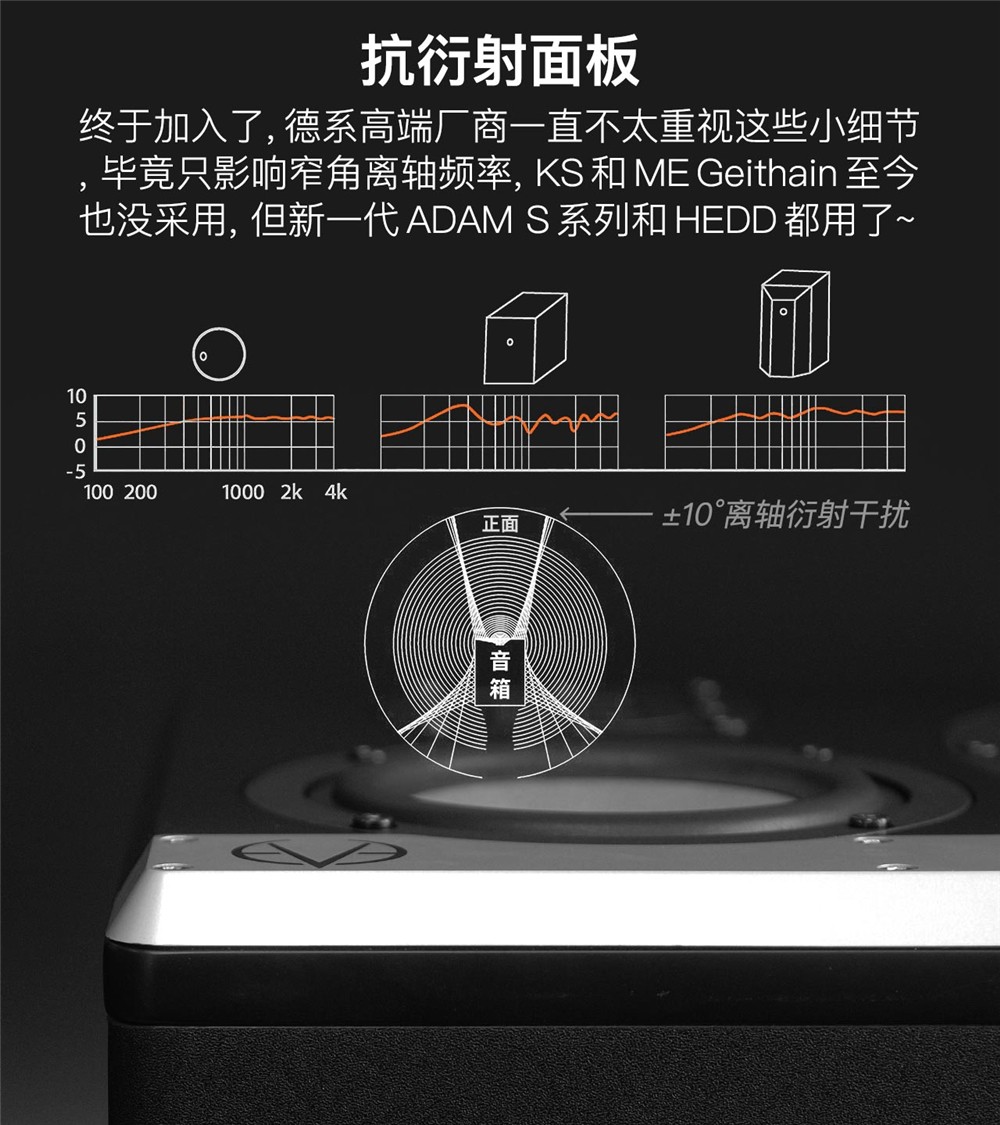 为此 EVE 也用上了自家的全部技术:SC307 的 DSP 三分频、SC407 的中音和高音单元、SC3010 的“TMW”设计、并且新增了更细致的 Mid 调节、首次引入了抗衍射折角。