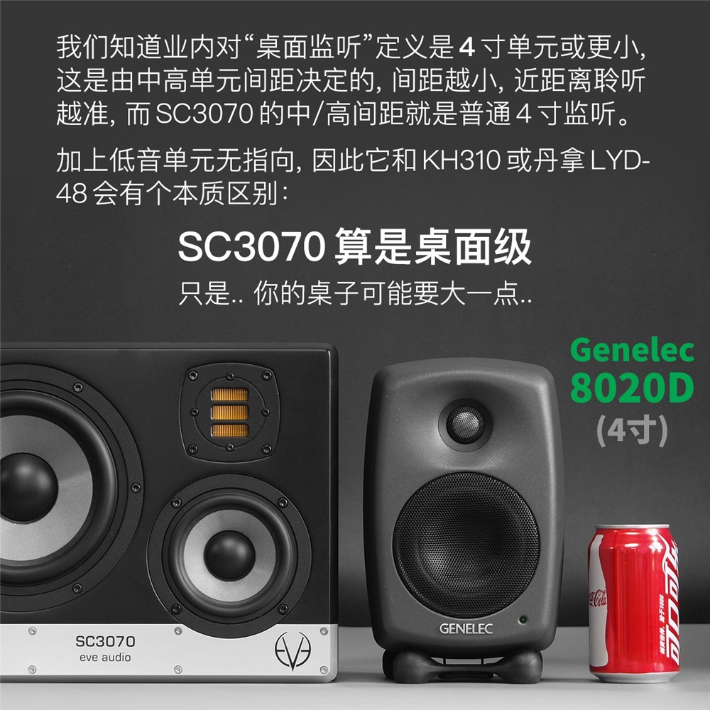 评测前看 SC3070 的官方介绍,很有意思:“用一对小音箱扩展了现有主监听产品线” (原文:expands the existing range of main monitors with a smaller studio monitor)。