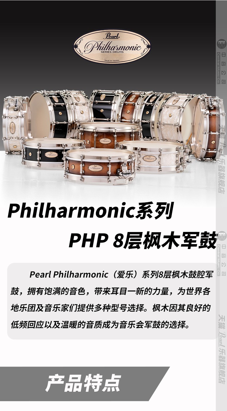 Pearl Philharmonic(爱乐)系列8层枫木鼓腔军鼓,拥有饱满的音色,带来耳目一新的力量,为世界各地乐团及音乐家们提供多种型号选择。