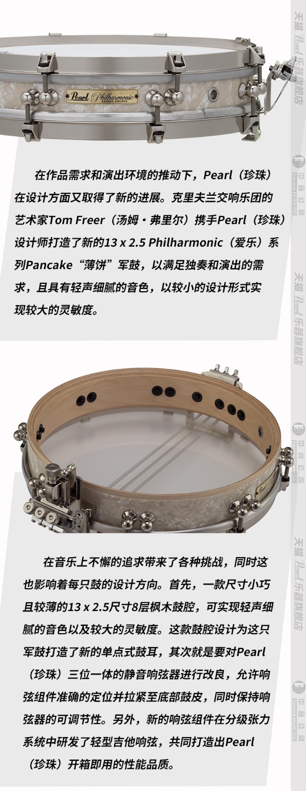 Pearl Philharmonic(爱乐)系列Pancake“薄饼”军鼓,增加了新的静音响弦器,将水晶般清晰的声音融入到了Philharmonic(爱乐)系列中。